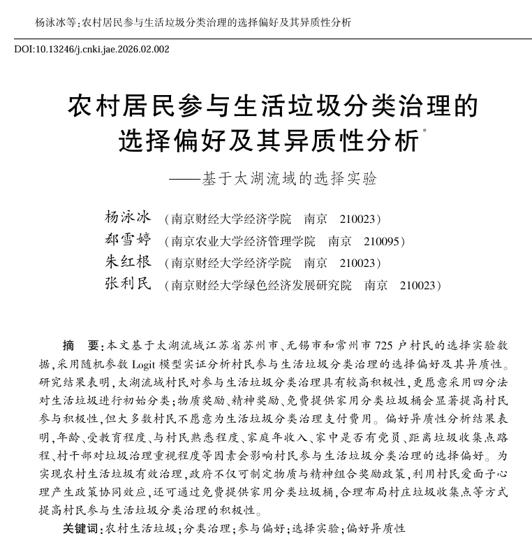 近日,我校绿色经济发展研究院首席专家、校党委书记张利民教授作为通讯作者的研究成果《农村居民参与生活垃圾分类治理的选择偏好及其异质性分析》在CSSCI来源期刊《农业技术经济》2026年第2期发表。